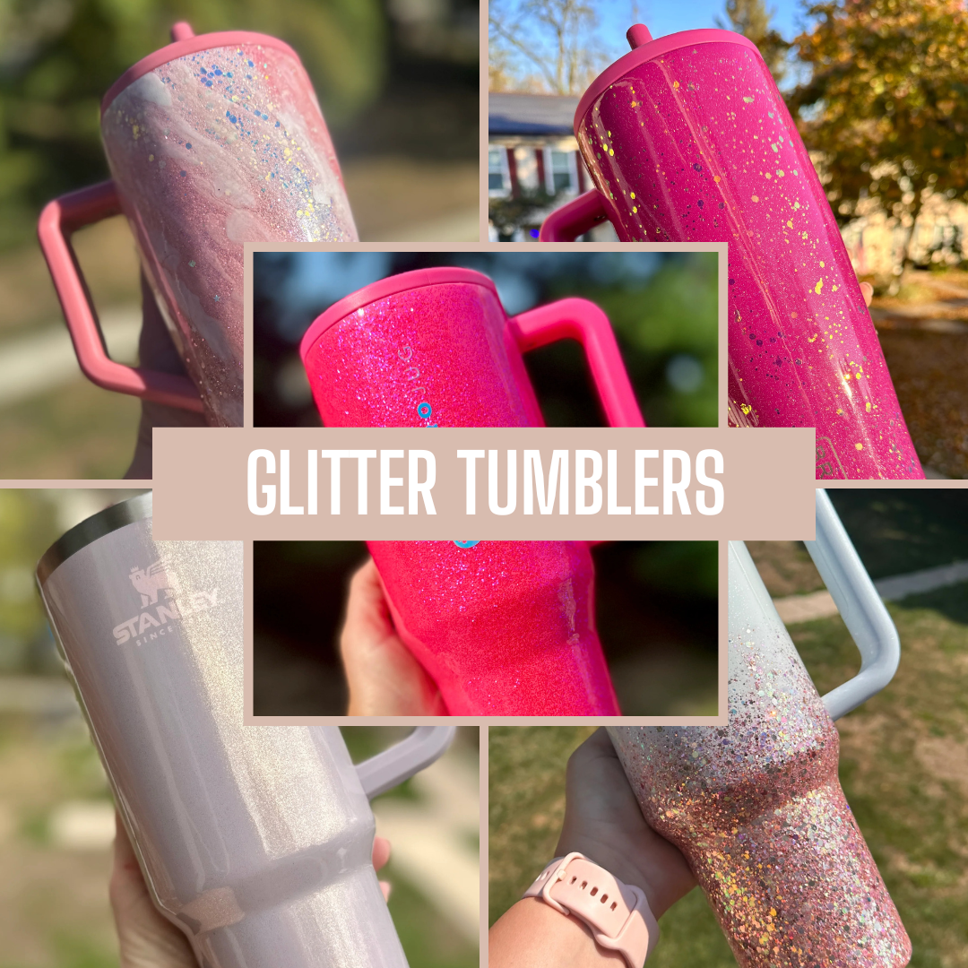 Each tumbler in this collection is crafted by hand using the glitter style you select, which may range from soft shimmer layers to bolder, more textured glitter patterns depending on the design. Some styles have a chunkier glitter feel you may be able to notice by touch, which is part of the handcrafted finish, while others are more subtle in appearance. All cups are sealed for durability with a smooth, epoxy-free topcoat.
