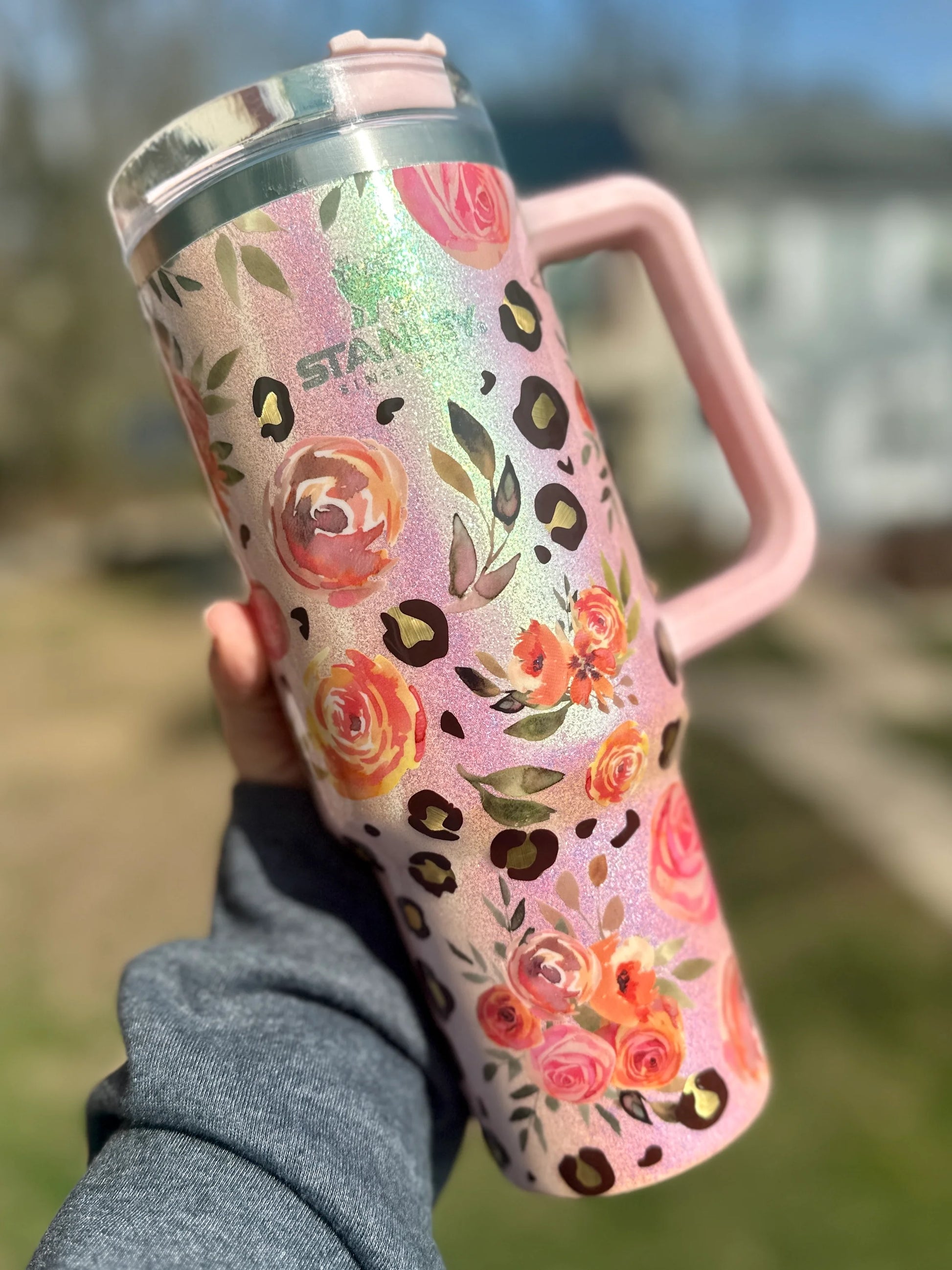 Custom tumblers are made just for you, often incorporating new, original graphics and design elements I haven’t used before. These cups start with your ideas—your theme, aesthetic, color palette, and design direction—and are finished by hand using distinct, boutique production methods. No two tumblers are ever identical, and the cups displayed here are examples for inspiration only, not products available to buy as-shown.