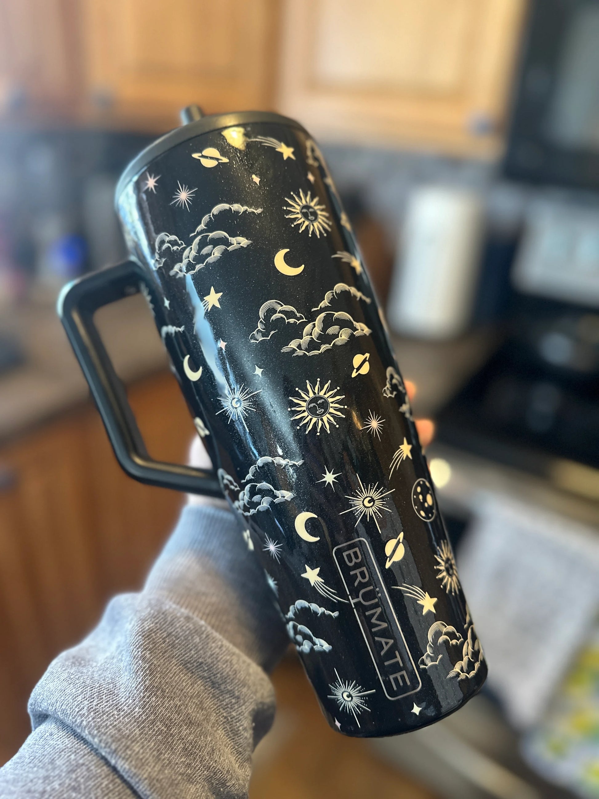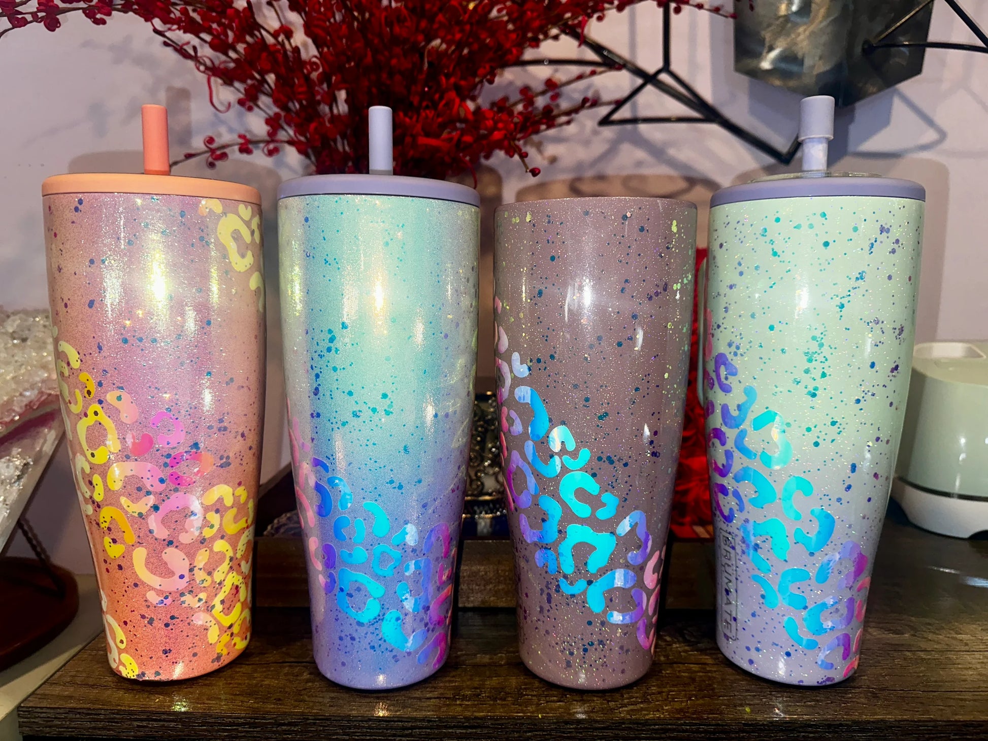 Graphic Tumblers feature artistic decals like Wildflowers, Cosmic Sky, Gothic Shine, Daisy, and three bold Leopard styles—small scattered spots, large statement spots, and Leopard Stripe or stripe-wrap designs. Decals are applied in either high-quality vinyl or durable UVDTF for sharp, vibrant detail, and every tumbler is sealed with a glossy and glittery protective coating for long-lasting wear. Because the design is coated over, the decals may still have a slightly raised texture—this is normal and part of the process. Prices vary by design to reflect the style and artwork detail, making each cup a custom piece with the signature Slay the Day Crafts touch.