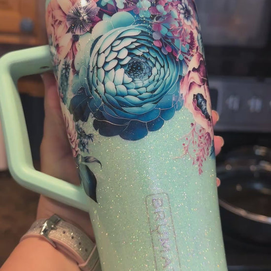 This 30 oz BrüMate features a glittered mint base with a soft shimmer, topped with vibrant floral decals in rich blues and pinks. Finished with an epoxy-free shine and fully ready to ship.